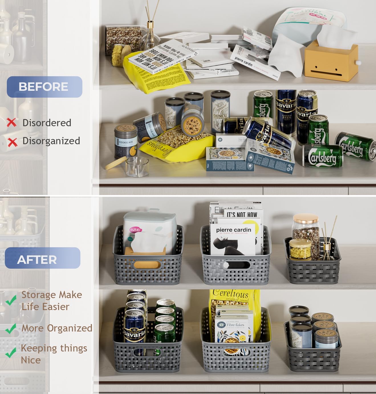 👍【Durable & Moisture-resistant】: Our storage baskets are not only durable, but also moisture-resistant, making them perfect for storing items in the kitchen or bathroom. Additionally, it prevents items from getting damp or moldy. This also means that the baskets are easy to clean and can be wiped down with a damp or dry cloth depending on the user’s preference. Whether you’re looking for a place to store dishes, utensils, or toiletries, these baskets provide a sturdy and hygienic solution.