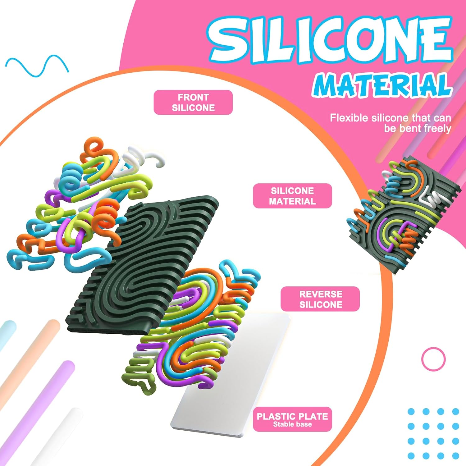 This is my second silicone sensory toy like this, and itâs a big improvement over my first one (a cylindrical pencil cup with short silicone strips, which was disappointing). This version is genuinely fun. The silicone “worms” work much better on flat surfaces, and the toy includes plenty of strings in a fun color combo.Both sides of the base have grooves, so you can create continuous designs front and back, which I love. The noodles fit perfectly in the grooves — it only takes a light press to secure them, but they stay in place once set. The only challenge is wrapping short sections (2 inches or less) over the curved edges, as they tend to pop out. Still, I like that it adds a bit of a challenge, making you think about the edges when designing.As an autistic adult, this toy ranks high on my list of favorite stim toys. It even comes with a little pouch to keep everything together, which is a nice bonus. Very happy with this one!