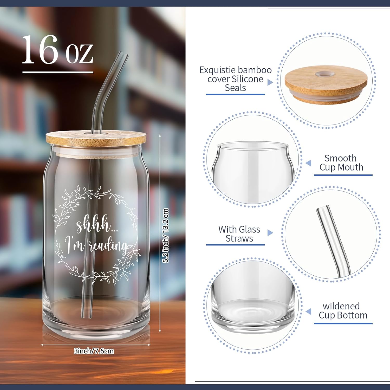 Book Lovers Gifts: elevate your hydration experience with our 16 oz transparent glass; Crafted from quality glass, it stands 5.2 inches tall with a 3 inch diameter, suitable for your daily drink needs; Its sleek design ensures easy cleaning and maintenance; Note: to preserve its integrity, avoid extreme temperature changes