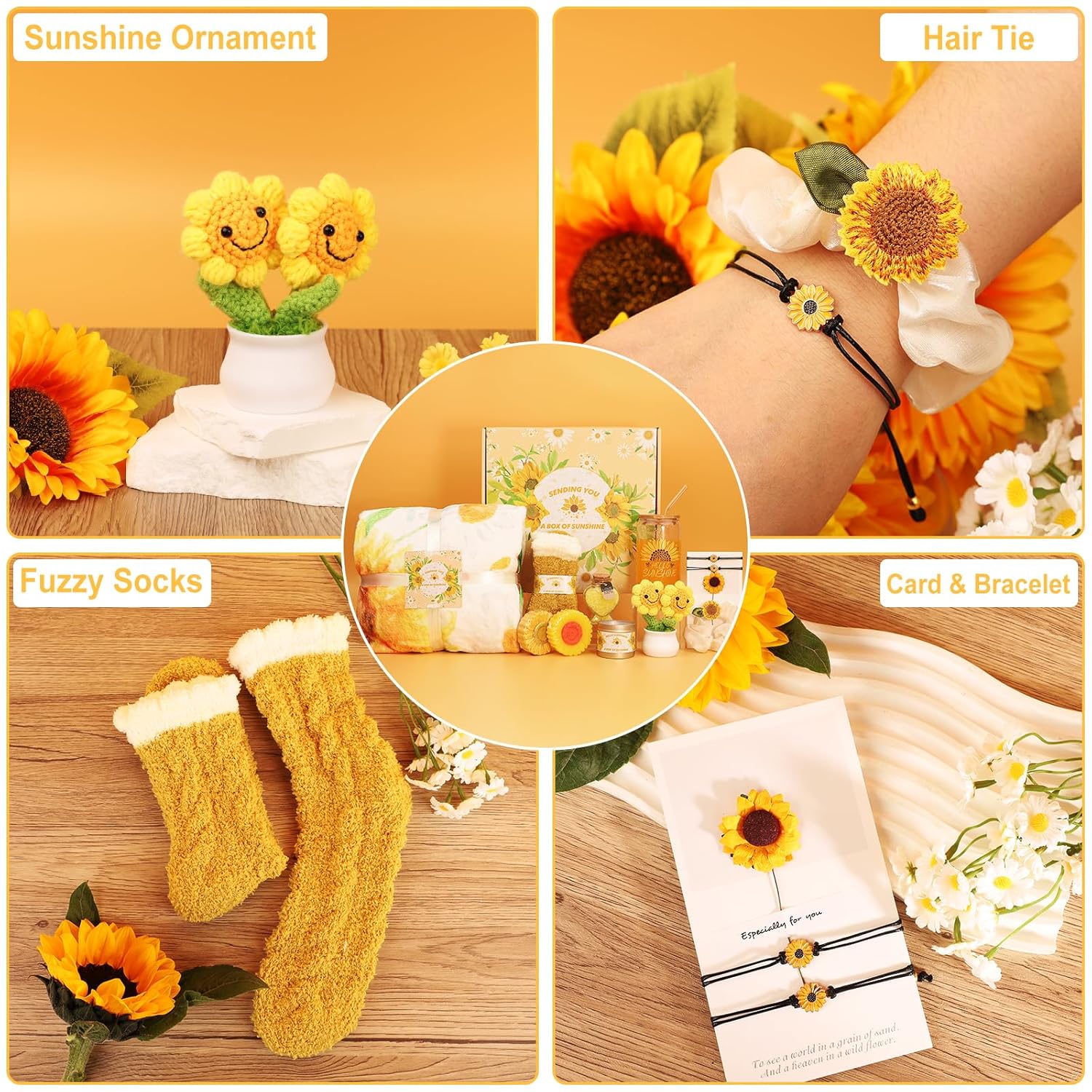 🌻【Uplifting Sunflower Gifts to Inspire Joy】 Packed in a stunning 12×12 inch sunflower-themed box, this set includes a 39×59 inch cozy sunflower blanket, a 16oz glass cup with a bamboo lid and straw, soft socks, a scented candle, a cute sunflower woven flower, bath salts, a heartfelt card, 2 sunflower soaps, a sunflower hair tie, 2 sunflower bracelets, and more. Every item is thoughtfully curated to bring her joy and relaxation.